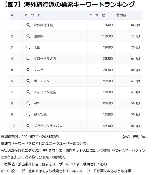 海外旅行派が特徴的に検索しているキーワードランキングを集計すると、5位に「マニラ」、6位に「ホーチミン」がランクインしています。7位には「フィリピン航空」が入り、東南アジアが人気の旅行先であることが読み取れます。その他、1位「海外旅行保険」といった保険関連の他、10位には世界各地の空港ラウンジを利用できる会員制プログラム「プライオリティパス」が入りました。