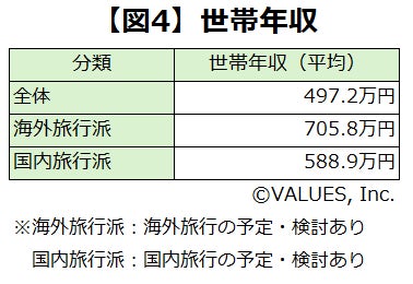 世帯年収について、夏の旅行の予定・検討ありと回答した人について世帯年収を比較すると、海外旅行派は約705万円、国内旅行派は約590万円と、100万円以上の開きがあることがわかりました。