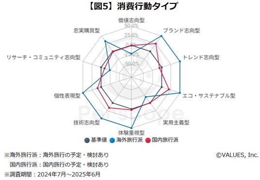 さらに、Web行動ログ×アンケートデータを活用した生活者分析ツール「Perscope(ペルスコープ)」を用いて、海外旅行派と国内旅行派に分け、消費行動タイプを分析すると、海外旅行派の回答者は「ブランド志向型」「トレンド志向型」「個性表現型」「体験重視型」などが高く、「価格志向型」が低い、という特徴がありました。世帯年収も高い海外旅行派には、「社会の動きに敏感で、トレンドに注目しつつも、人とは違う自分らしい経験や思い出作りがしたい、そのためには投資は惜しまない」という人が多いのかもしれません。