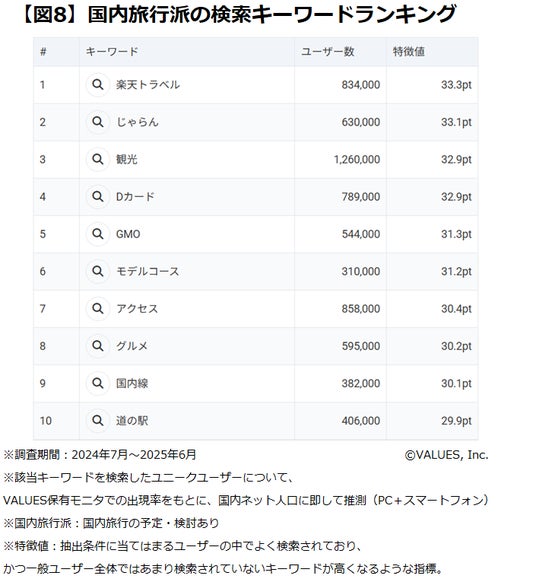 同様に国内旅行派の特徴的な検索キーワードランキングを集計すると、3位「観光」、6位「モデルコース」、8位「グルメ」、10位「道の駅」など観光やグルメ消費に積極的な傾向が読み取れます。