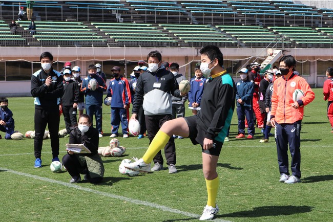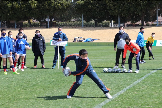 代替イベント当日は、いずれもカインズカップ出身で、元ラグビー男子日本代表の霜村誠一さんと、東京五輪の7人制ラグビー女子日本代表の共同主将を務めた清水麻有さんが特別ゲストとして来場。参加した約100人の子どもたちと、トークショーやパス練習、ミニゲーム等で触れ合い、楽しいひとときを過ごしました。