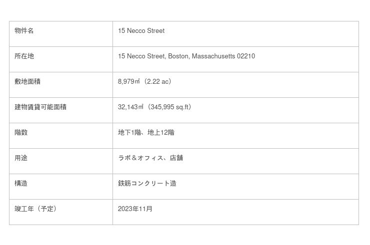 マサチューセッツ州ボストン市「15 Necco Street」 ライフサイエンス企業向けラボ&オフィスの共同開発事業