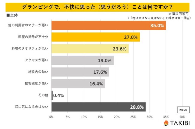 グランピングに行ったことがある・興味がある10代~60代の男女を対象とした「グランピングで不快に思った(思うだろう)ことは何ですか?」というアンケートを行ったところ、約7割が何かしらにおいて「不快」に思っており、1番多かった回答は「他の利用者のマナーが悪い」で35.0%となりました。次いで「部屋の掃除が不十分」が27.0%、「料理のクオリティが低い」が23.6%と続いております。