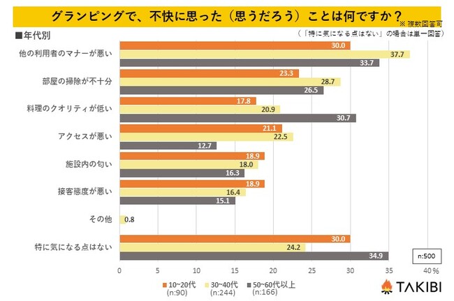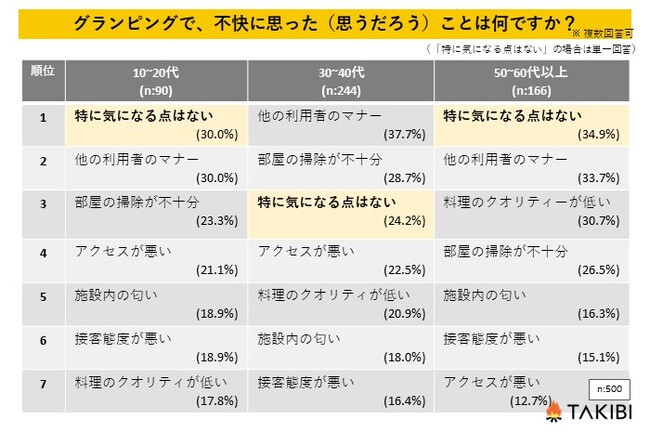 一方、どの年代でも「他の利用者のマナーが悪い」が上位に入っており、施設側への不快感というよりも、利用者のマナーの悪さに目が行く方が多いようです。グランピング利用時には、一人ひとりのモラルが他の利用客の思い出作りにも影響することを認識しながら、最低限のマナーを持って楽しみましょう。