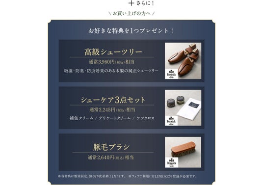 今回のグローバルスタイルとBerwick1707の人気商品を組み合わせた"特別プラン"は、早割クーポン500円引きと高級オプション5,000円分無料が付属するだけでなく、シューケア用品の特典も選べるなど、大変豪華な内容となっております。