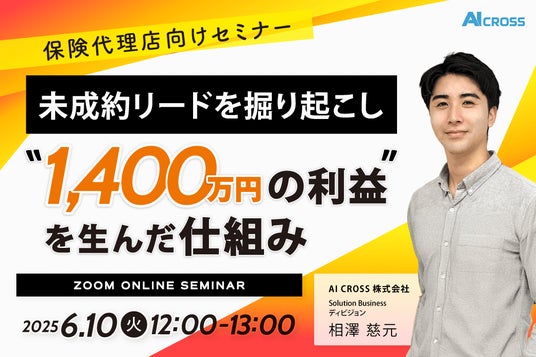 AI CROSS株式会社(本社:東京都港区、代表取締役CEO:原田 典子、以下「AI CROSS」)は、当社主催の無料オンラインセミナー「【保険代理店向け】未成約リードを掘り起こし “1,400万円の利益”を生んだ仕組み」を2025年6月10日(火)12時より開催します。