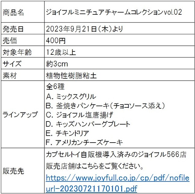 「ジョイフルミニチュアチャームコレクションvol.02」(1回400円全6種)を2023年9月21日(木)15時より、「ジョイフル」のカプセルトイ自販機にて数量限定で販売いたします。