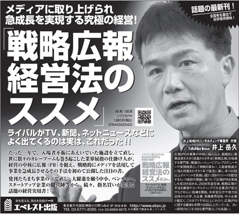 コンサルティングが3年先まで埋まっている辣腕コンサルタントの井上岳久(井上戦略PRコンサルティング事務所)が、広報PRを経営および事業の中核に組み込み戦略的に事業成長を大きく促進させる戦略広報の実践実務書を書き下ろしました。
