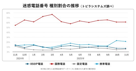 2025年11月に新たにトビラシステムズの迷惑電話番号データベースに登録された番号の種別割合は、国際電話番号が61.2%(前月比±0%)で、横ばいで推移しています。