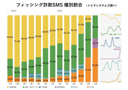 2025年11月は、これまで宅配事業者をかたるSMSをばらまいていたマルウェアの活動が「Apple」をかたるSMSのばらまきに切り替わったことで、宅配事業者をかたる手口の割合が激減し、「Apple」を含むその他の手口の割合が51.0%まで急増しました。