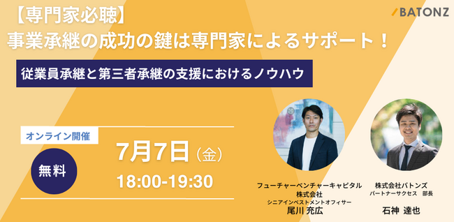 M&A総合支援プラットフォーム「BATONZ(バトンズ)」を運営する株式会社バトンズ(本社:東京都中央区、代表取締役:神瀬悠一、以下バトンズ)は、フューチャーベンチャーキャピタル株式会社(本社:京都市中京区、代表取締役:金武偉、以下FVC)と共催で、従業員承継と第三者承継それぞれの支援のノウハウについてお伝えするセミナーを7月7日(金)に開催いたします。