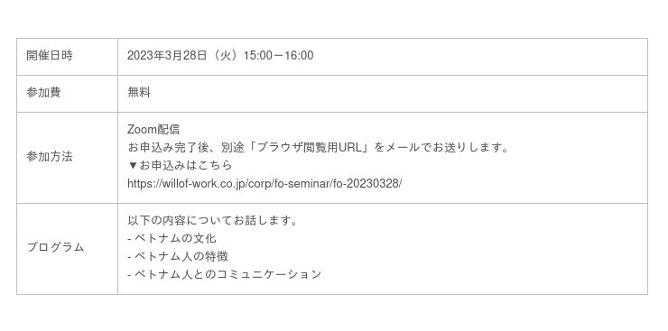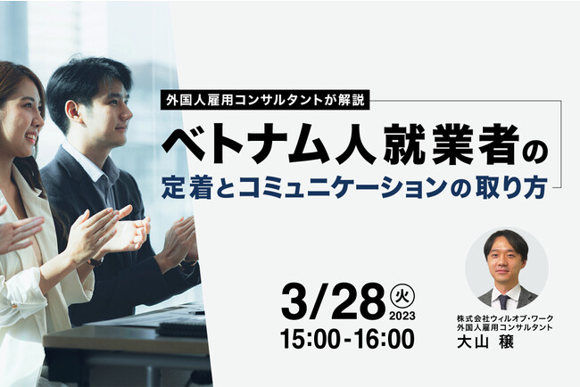 ウィルグループの総合人材サービスを手掛ける株式会社ウィルオブ・ワーク(本社:東京都新宿区、代表取締役社長:告野 崇)は、無料オンラインセミナー『外国人雇用コンサルタントが解説 ベトナム人就業者の定着とコミュニケーションの取り方 』を、2023年3月28日(火)に開催します。