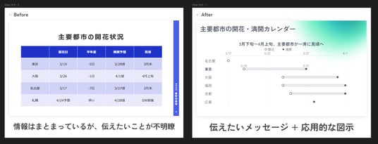 テーマは日本の開花情報をスライドにまとめてもらうというもの。ただAIツールを使っただけのスライド(左)と、目的・構成・制約等をしっかり伝えた上で作成されたスライド(右)の一部。