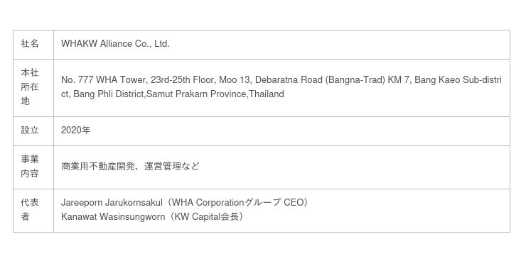 本プロジェクトの共同事業者であるWHAKW社はタイにおける工業団地、物流施設開発の最大手デベロッパーであるWHA Corporation Pcl.(本社:タイ王国サムットプラカーン県、Group CEO:Jareeporn Jarukornsakul、以下「WHA社」)とタイの商業用不動産投資会社であるKW Capital Co., Ltd.(本社:タイ王国バンコク都、Chairman:Kanawat Wasinsungworn、以下「KW社」)によって設立された会社であり、バンコク中心部のプライム立地においてハイクラス商業ビルの開発を手掛けています。