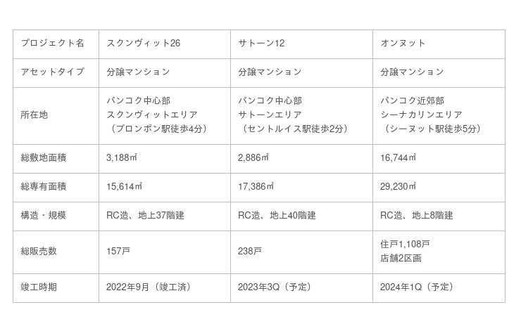 タイはASEAN諸国の中で、GDP規模がインドネシアに次ぐ大国で、今後も観光業の本格的な復調を契機とする安定的な経済成長に伴い、中長期的に旺盛な不動産需要が見込まれるマーケットです。当社は、現グループ中期経営計画において、「海外事業の成長」を重点戦略の一つとして掲げており、その中でも2018年より進出し確かな実績のあるタイでは将来に渡って積極的に事業機会の獲得に努めて参ります。