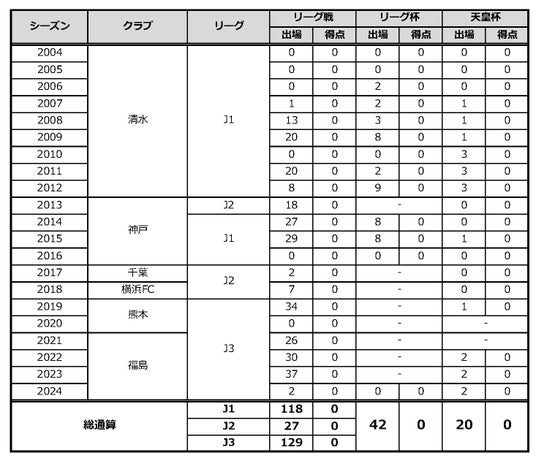 サッカー歴:清水FC→清水エスパルスJrユース→清水エスパルスユース→清水エスパルス→ヴィッセル神戸→ジェフユナイテッド千葉→横浜FC→ジェフユナイテッド千葉→ロアッソ熊本→福島ユナイテッドFC