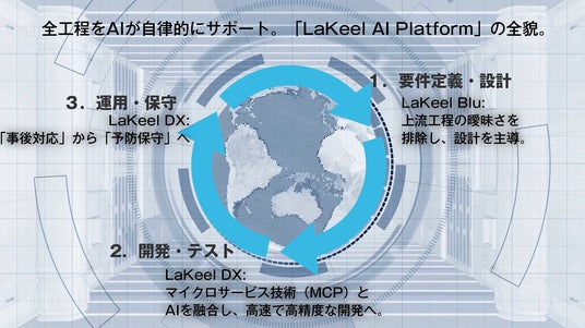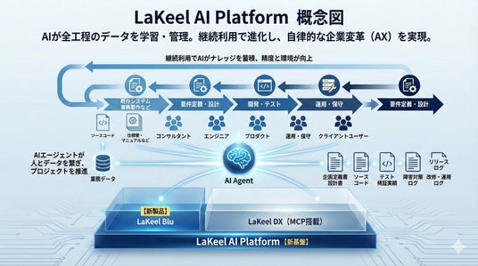 株式会社ラキール(本社:東京都港区、代表取締役社長:久保 努、以下 「ラキール」)は、システムの要件定義・設計から開発、運用までの全工程をAIが自律的にサポートする新世代のAI プラットフォーム「LaKeel AI Platform(ラキールAIプラットフォーム)」を発表します。本プラットフォームは、既存の主力製品である「LaKeel DX」に加え、上流工程をAIで支援する新製品「LaKeel Blu(ラキールブルー)」を統合したもので、2026年2月より順次提供を開始します。