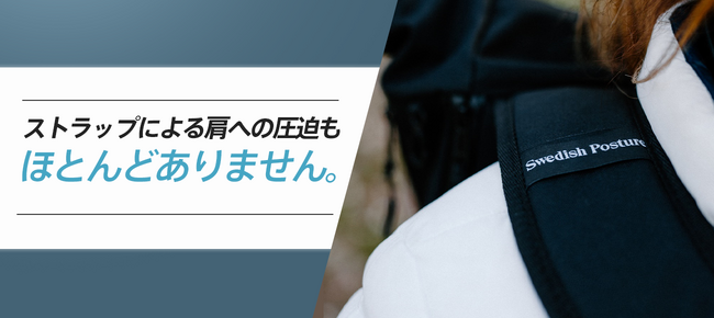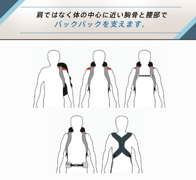 バックパックを背負うだけで体を正しい姿勢に導くと共に、体幹で支えることで肩や腰に掛かる体圧を分散し、驚くほど荷物が軽く感じられる優れもの。