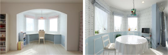 素材感のある石張り塔屋のある洋館。アリスの世界観を随所に取り入れたこだわりの内装です。