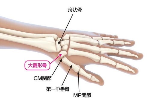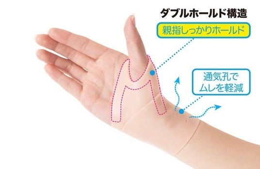 ダブルホールド構造は手首から親指につながる関節「大菱形骨」をしっかり固定します!親指を動かした際に「手首の関節」と「親指の関節」とのずれが生じると負担を感じるため、ホールドすることで手首と親指をしっかりサポートします!