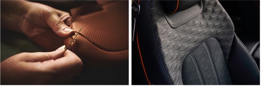 (左)シートに使われるレザーを手縫いする様子/(右)完成したレザーのシート