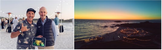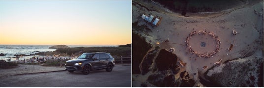 (左)カリフォルニア沿岸とベンテイガ/(右)モントレーカーウィーク ペブルビーチディナー 上空からの様子