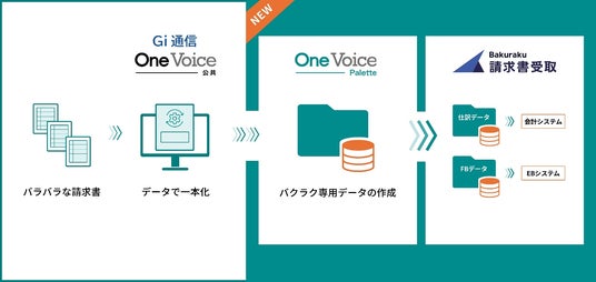 本連携では、「Gi通信」「OneVoice公共」(および会計処理業務効率化プラットフォーム「OneVoicePalette」)でデータ化した詳細な内訳・仕訳情報を「バクラク請求書受取」に取り込むだけで、同システムの高精度な自動処理機能が最大限に活かされ、店舗・拠点ごとの按分やサービス名に応じた細かな科目仕訳が組み込まれた最適な仕訳・振込データを自動作成されます。