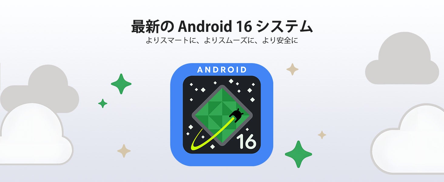 本機の最大の特長は、Google が提供する最新のモバイルオペレーティングシステム「Android 16」を搭載している点です。Android 16 は、より直感的なユーザーインターフェース、強化されたプライバシー保護 と セキュリティ機能 を提供し、お子様の利用もより安心です。