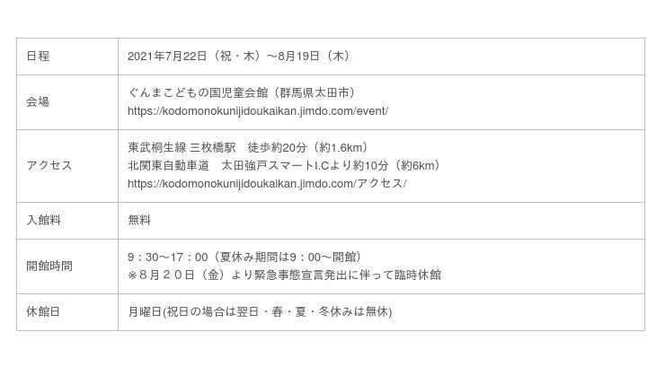 まで、「ぐんまこどもの国児童会館(群馬県太田市)」にて展示いたします。