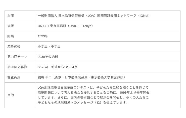 UNICEF東京事務所(東京都渋谷区)の後援による「JQA地球環境世界児童画コンテスト」は、1999年より開催しております。