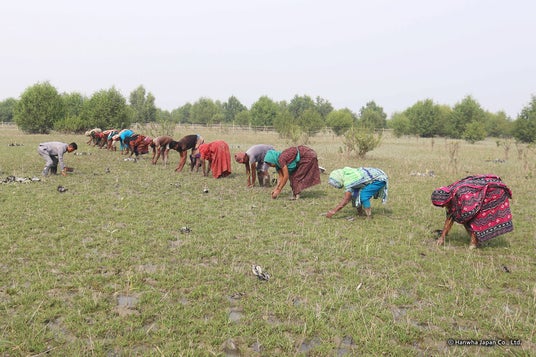 マングローブ苗を植える住民の皆さん。地域の手で生態系回復を実現