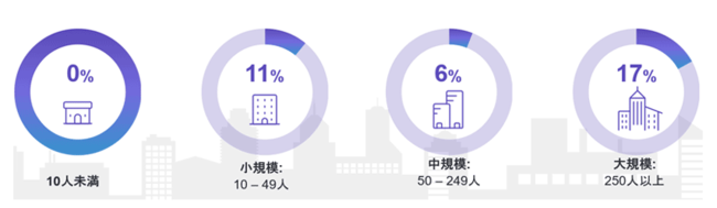 組織規模別では、大規模組織が前四半期比4ポイント増の純雇用予測+17%で最も高い雇用予測です。従業員数10人未満の組織は、前四半期比8ポイント増の純雇用予測±0%の結果となりました。