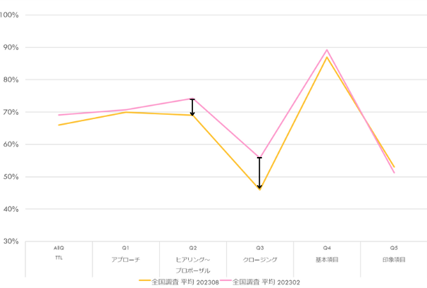 これまで全国調査を行ってきた中では、各地域別の特性はそれほど大きく出ていなかったのが実際でした。しかし、今回の結果を見てみると、大阪地区における、接客の中身である「ヒアリング~プロポーザル」および「クロージング」のスコアが著しく下がっている、というポイントがありました。地域別の大枠の動きと比較して、自社ブランドの特性を重ねてみることでより有効的なアクションを取っていけるのではないかと考えます。