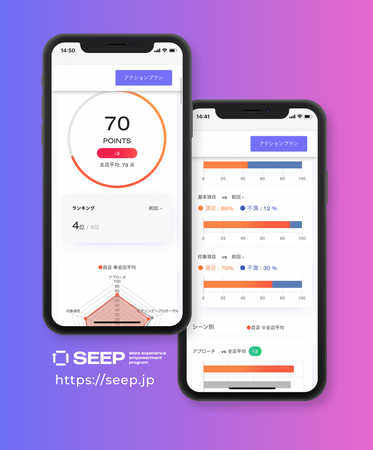 SEEPの調査設計は、接客プロセスのシーンと接客体験全体を分析しています。接客プロセスは、お客様との出会いの部分である「アプローチ」、そこからお客様に寄り添う形で要望を聞きながら自社商品の提案を行う「ヒアリング~プロポーザル」、そして最終プロセスである「クロージング」の3つのシーンとなります。そこに「基本項目」「印象項目」を追加し、5つのシーンから調査した結果をポイント制で示しています。