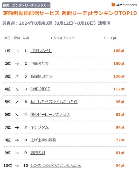 エンタテイメント業界に向けたデータ×デジタルマーケティングサービスを提供するGEM Partners株式会社(ジェムパートナーズ、所在地:東京都港区、代表取締役:梅津文)は8月22日、複数の定額制動画配信サービスを横断集計した2024年8月第3週(8月12日~8月18日)速報値のエンタメブランド別(※1)の週間リーチptランキングTOP10を発表します。