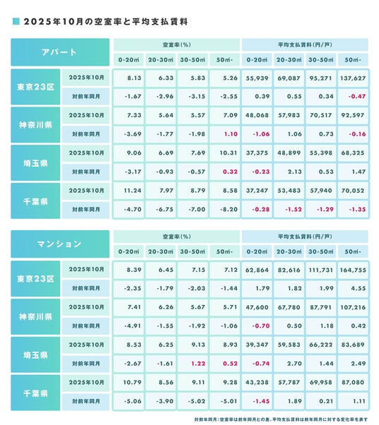 ■2025年10月の空室率と平均支払賃料および前年同月比
