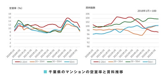 千葉県西部(柏市、松戸市、流山市、我孫子市、市川市、浦安市、習志野市、船橋市)では、アパート・マンション共に空室率の改善が継続しています。一方で、支払い賃料は、アパートの全面積帯とマンションの0-20平方メートル で、前月比で下落しています。前年同月比の支払い賃料上昇率は、アパートの0-20平方メートル 、50平方メートル -、マンションの0-20平方メートル でマイナス、アパートの20-30平方メートル 、30-50平方メートル 、マンションの30-50平方メートル 、50平方メートル -については、上昇しているものの消費者物価指数の上昇率を下回っています。消費者物価指数の上昇率並みに支払い賃料が上昇しているのは、唯一マンションの20-30平方メートル のみであり、賃貸住宅の賃料改定が順調に進んでいないことがうかがえます。