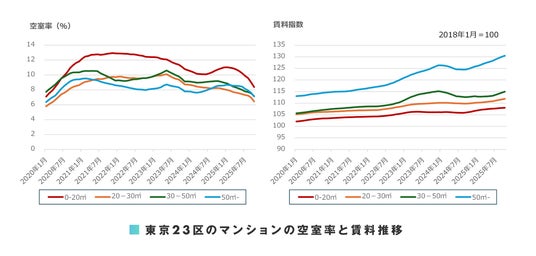東京23区ではアパート・マンション共にすべての面積帯で空室率が改善しました。募集賃料の上昇は継続していますが、マンションの家族向け(50平方メートル -)を除き、平均支払い賃料(以下、支払い賃料)の上昇は伸び悩んでいます。東京23区の2025年10月の消費者物価指数は前年同月比+2.8%でしたが、アパートの支払い家賃の年間上昇率は0-20平方メートル が+0.39%、20-30平方メートル が+0.55%、30-50平方メートル が+0.34%と、消費者物価上昇率に比較して低い水準にとどまっています。50平方メートル -は▲0.47%と、逆に下落しています。マンションの支払い家賃の年間上昇率はアパートよりも高く、0-20平方メートル が+1.79%、20-30平方メートル が+1.82%、30-50平方メートル が+1.99%、50平方メートル -は+4.55%であり、50平方メートル -は消費者物価指数の上昇率を上回っていますが、その他の面積帯の上昇率は消費者物価指数の上昇率を下回っています。