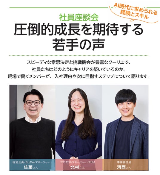 役員陣のインタビューでは、急成長を支える経営方針や、事業を牽引できるリーダー人材の育成に注力する考え方が語られました。若手社員の声としても、早い段階からチャレンジの機会が与えられ、経営陣からのフィードバックを受けながら実践を重ねることで成長を実感できている様子が紹介されています。役職や年次に関係なく意見交換できるフラットな組織風土が根付いており、社員同士が切磋琢磨しながらスキルを磨いています。