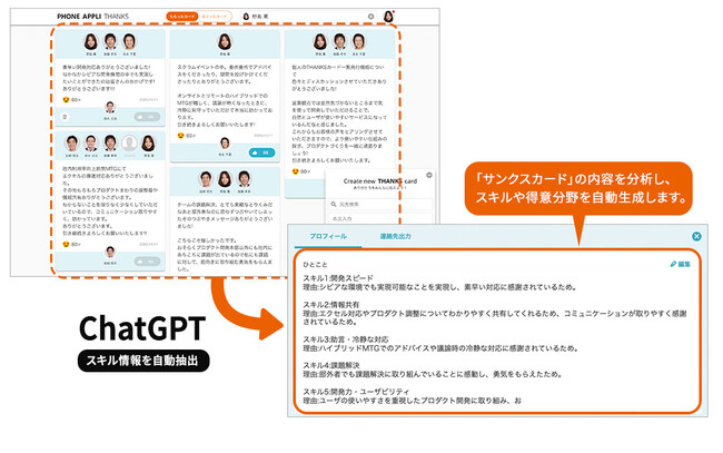 働き方を変えるDXサービスを運営する株式会社PHONE APPLI(本社:東京都港区、代表取締役社長:石原 洋介)は、従業員同士のコミュニケーションをより活性化させ、組織のコラボレーションを促進するため、ChatGPT(※)と従業員間で感謝や称賛を“贈りあう”「PHONE APPLI THANKS」を組み合わせた新サービスの実証実験を開始したことをお知らせいたします。