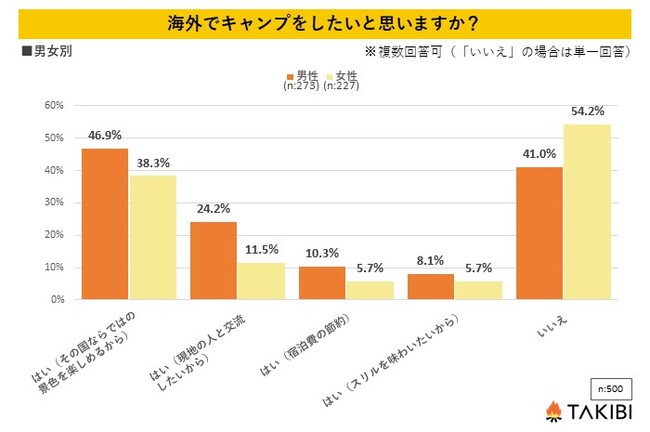 男女別で見ると、女性で海外でキャンプをしたいと考えている方が45.8%であるのに対し、男性は59.0%と、男性の方が圧倒的に海外でのキャンプに前向きであるということが分かります。