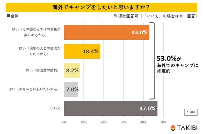 グランピングに行ったことがある・興味がある10代~60代の男女を対象とした「海外でキャンプをしたいと思いますか?」というアンケートを行ったところ、53.0%が前向きな考えであることが分かりました。