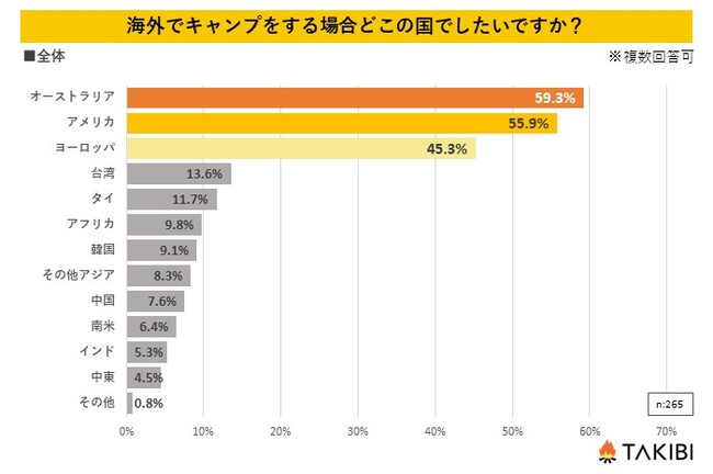 質問1で「はい」と回答した方へ「海外でキャンプをする場合どこの国でしたいですか?」と尋ねたところ、1位:オーストラリア(59.3%)、2位:アメリカ(55.9%)、3位:ヨーロッパ(45.3%)という結果になりました。