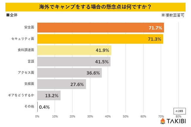 次に、海外でキャンプをしたいと回答した方へ、「海外でキャンプをする際の懸念点」を尋ねたところ、一番多かった回答が、「安全面」で71.7%、次いで「セキュリティ面」で71.3%となりました。