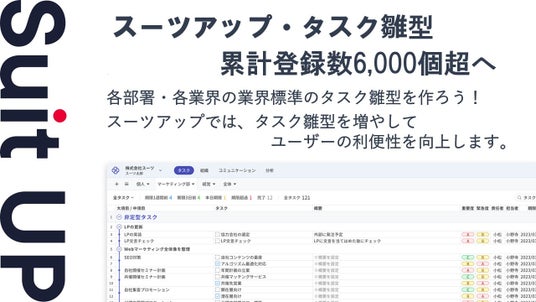 株式会社スーツ(所在地:東京都千代田区、代表取締役社長CEO:小松 裕介)は、チームでかんたん、毎日続けられるプロジェクト・タスク管理ツールの経営支援クラウド「Suit UP」(スーツアップ)のタスク雛型の累計登録数が6,000個を超えたことをお知らせします。
