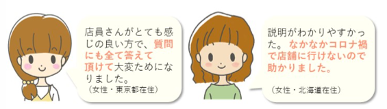 コロナ禍における、妊娠中の方や小さなお子さまのいらっしゃる方のお買物をサポートするため、ご自宅にいながら商品の説明が聞け、相談できる、個別のお買物支援サービス(要予約・無料)として、2020年5月からスタートしました。同年11月には、第13回ペアレンティングアワードを「コト部門」で受賞した実績があります。