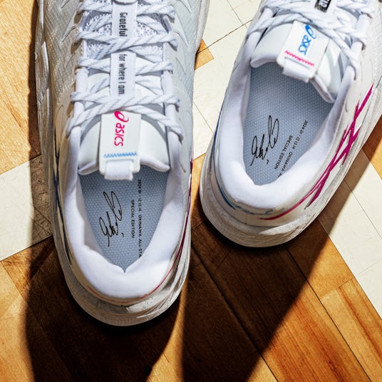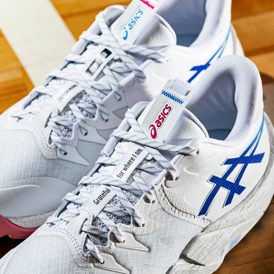 河村勇輝選手の試合前のルーティンである一礼(自分が今コートに立てることは当たり前ではないということを再認識し、全力で戦うという気持ちを込めコートに入る前に一礼を行うこと)を言語化し、「Grateful for where I am.(今に感謝する。)」をベロ部(シュータン)にデザインしています。