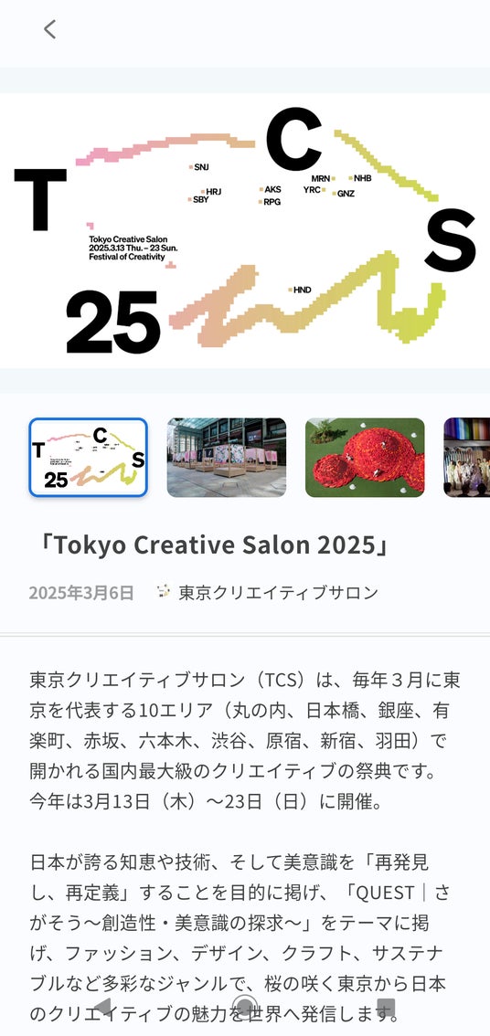 東京都内で13日に始まった国内最大級のファッションとデザインの祭典「東京クリエイティブサロン2025」の情報を中心に配信します。祭典では原宿や渋谷、銀座など10カ所でワークショップやファッションショー、アート作品の展示などがあり、ロークル内で各イベントの見どころを掲載しています。
