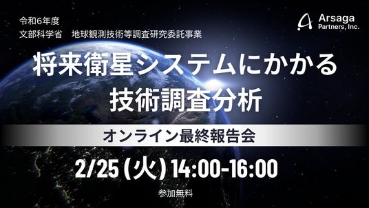 企業のDXを促進するアルサーガパートナーズ株式会社(本社:東京都渋谷区、代表取締役社長 CEO/CTO:小俣泰明、以下「アルサーガパートナーズ」)は、2025年2月25日(火)14:00~16:00に、文部科学省【令和6年度地球観測技術等調査研究委託事業「将来衛星システムにかかる技術調査分析」】の最終報告会をオンライン(Microsoft Teams)にて開催いたします。