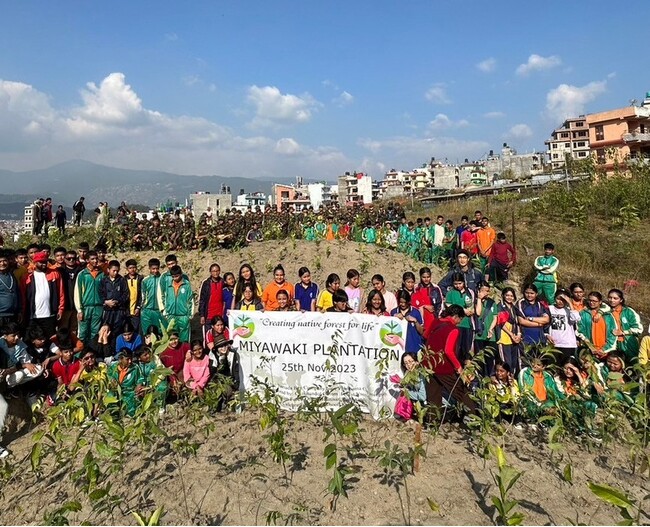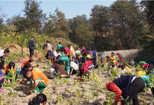 翌1999年にネパールで植樹活動を開始し、2001年からは、現地の気候風土に合った在来種の木々を密植、混植する「宮脇方式」を実践しています。これは、植物生態学の権威である横浜国立大学名誉教授の故・宮脇昭(みやわき あきら)氏が提唱する植樹方法です。